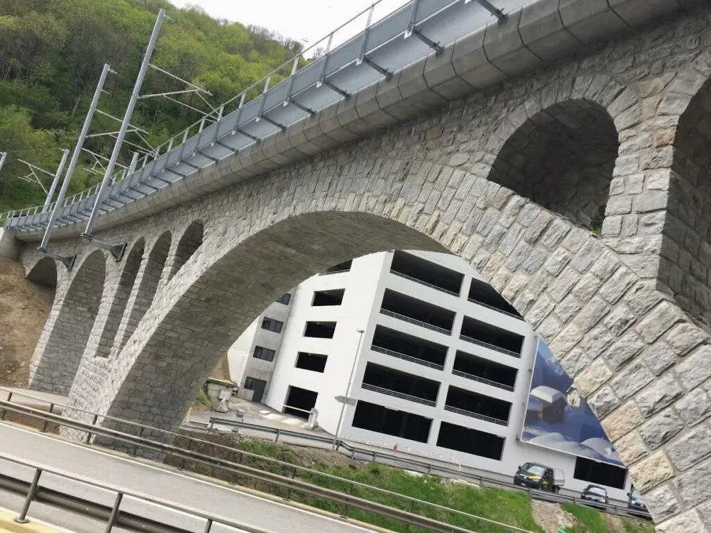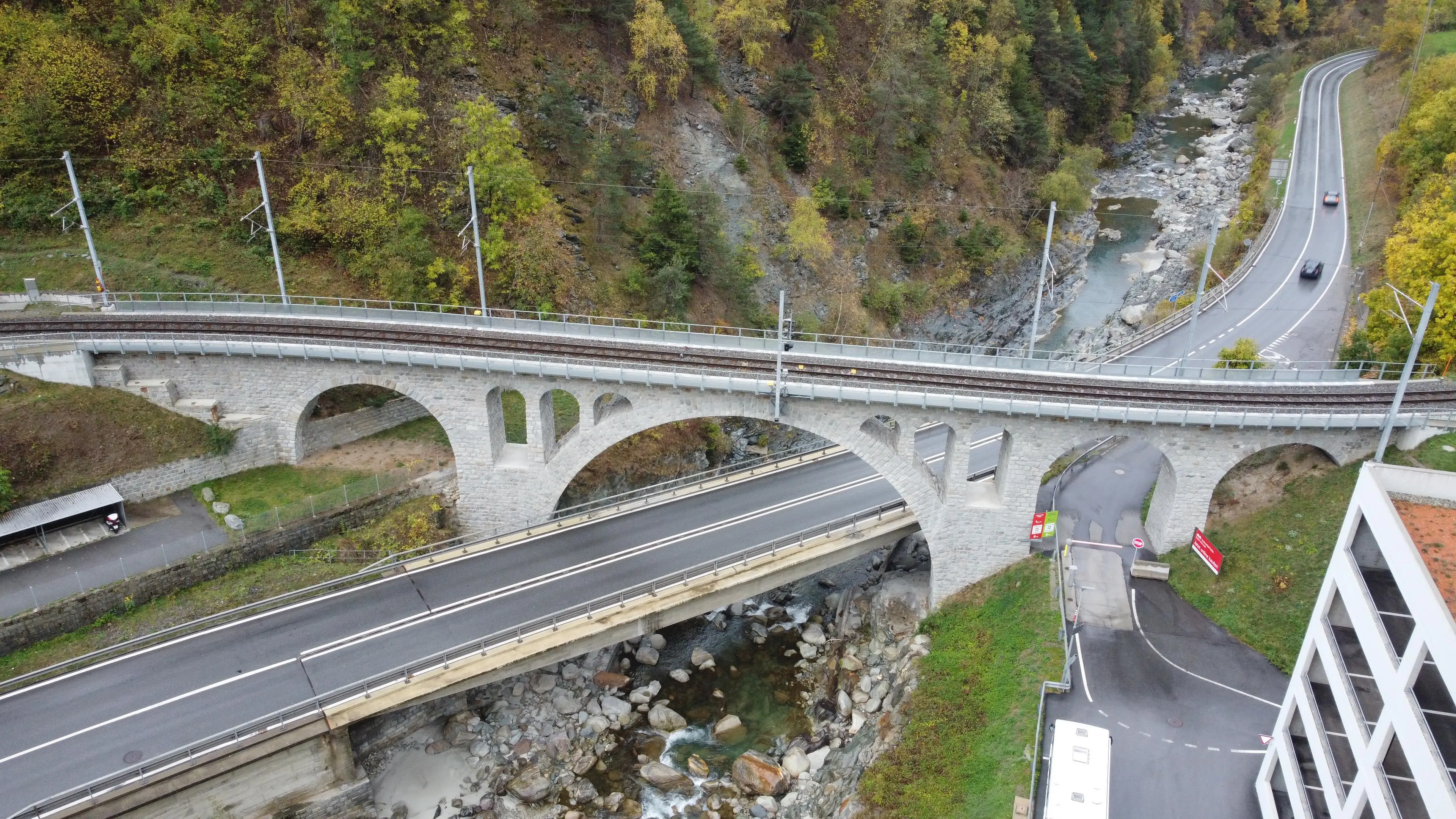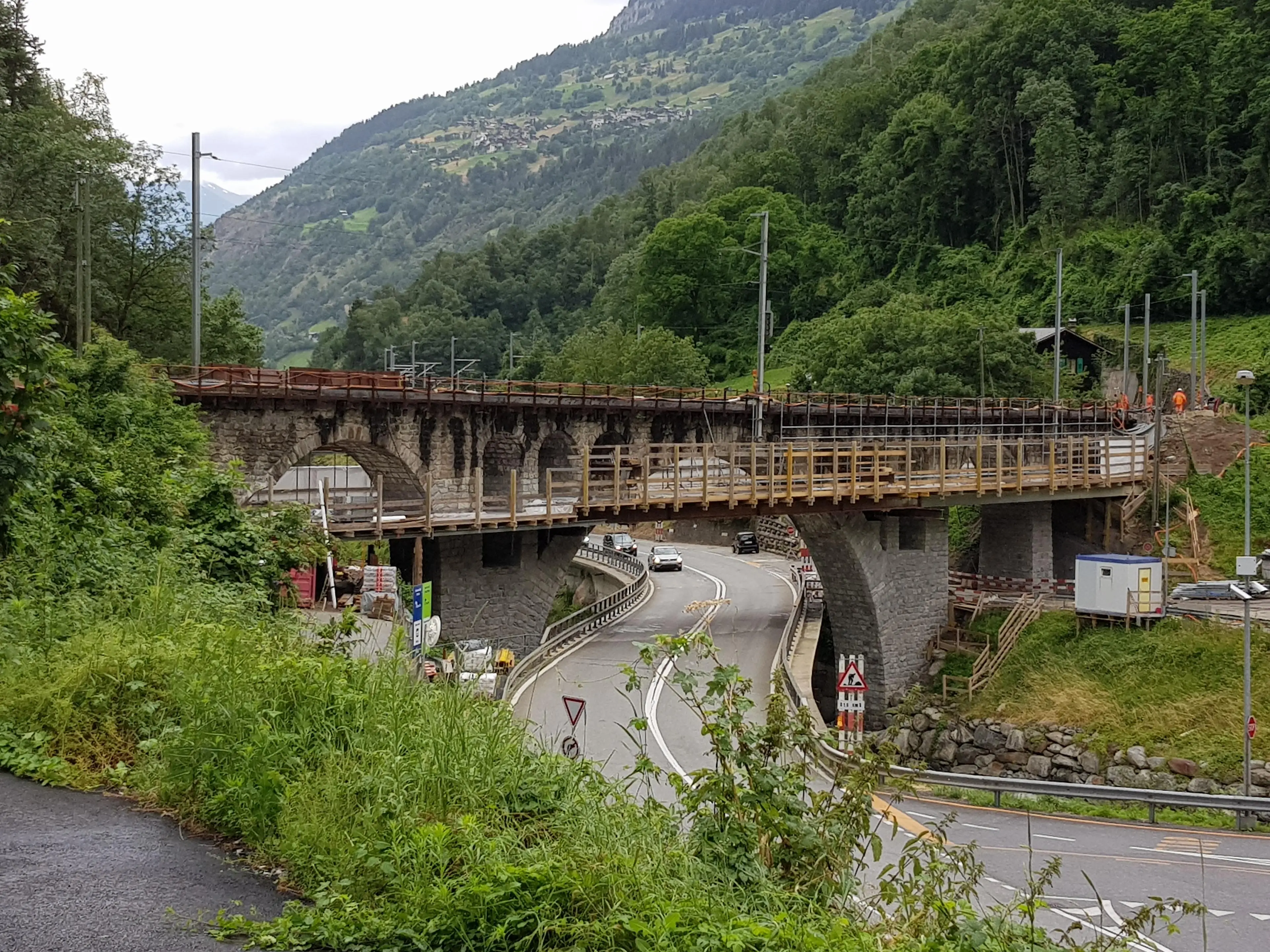 Das 77 m lange Nussbaumviadukt befindet sich im Abschnitt zwischen Brig und Oberwald in der Gemeinde Grengiols. Das Viadukt ist als asymmetrische 4-feldrige Bogenbrücke aus Natursteinmauerwerk konzipiert. Die am Mauerwerk festgestellten Schäden beschränkten sich auf Aussinterungen und Ausblühungen entlang der Mörtelfugen infolge unkontrollierter Entwässerung des Brückentroges. Zudem entstanden Risse und Ausbrüche im Fugenmörtel infolge Frosteinwirkung und vereinzelt infolge unterschiedlicher Steifigkeit des Fugenmörtels im Vergleich zum Natursteinmauerwerk. Durch die beschriebenen Schäden war die Dauerhaftigkeit des Viadukts eingeschränkt und musste daher instandgesetzt werden. Die Instandsetzungsarbeiten am Nussbaumviadukt haben im März 2017 begonnen und dauerten bis Frühling 2018.