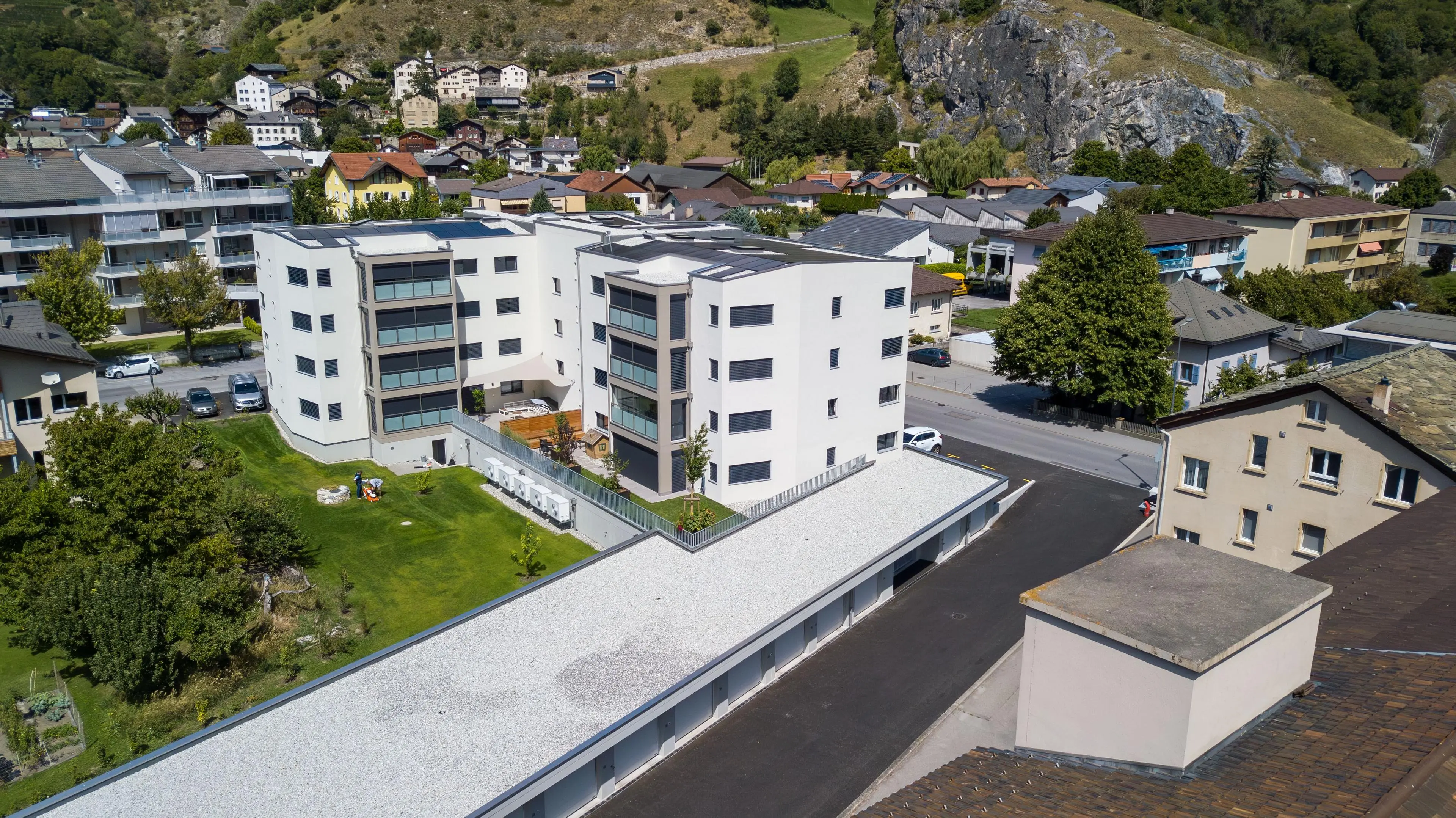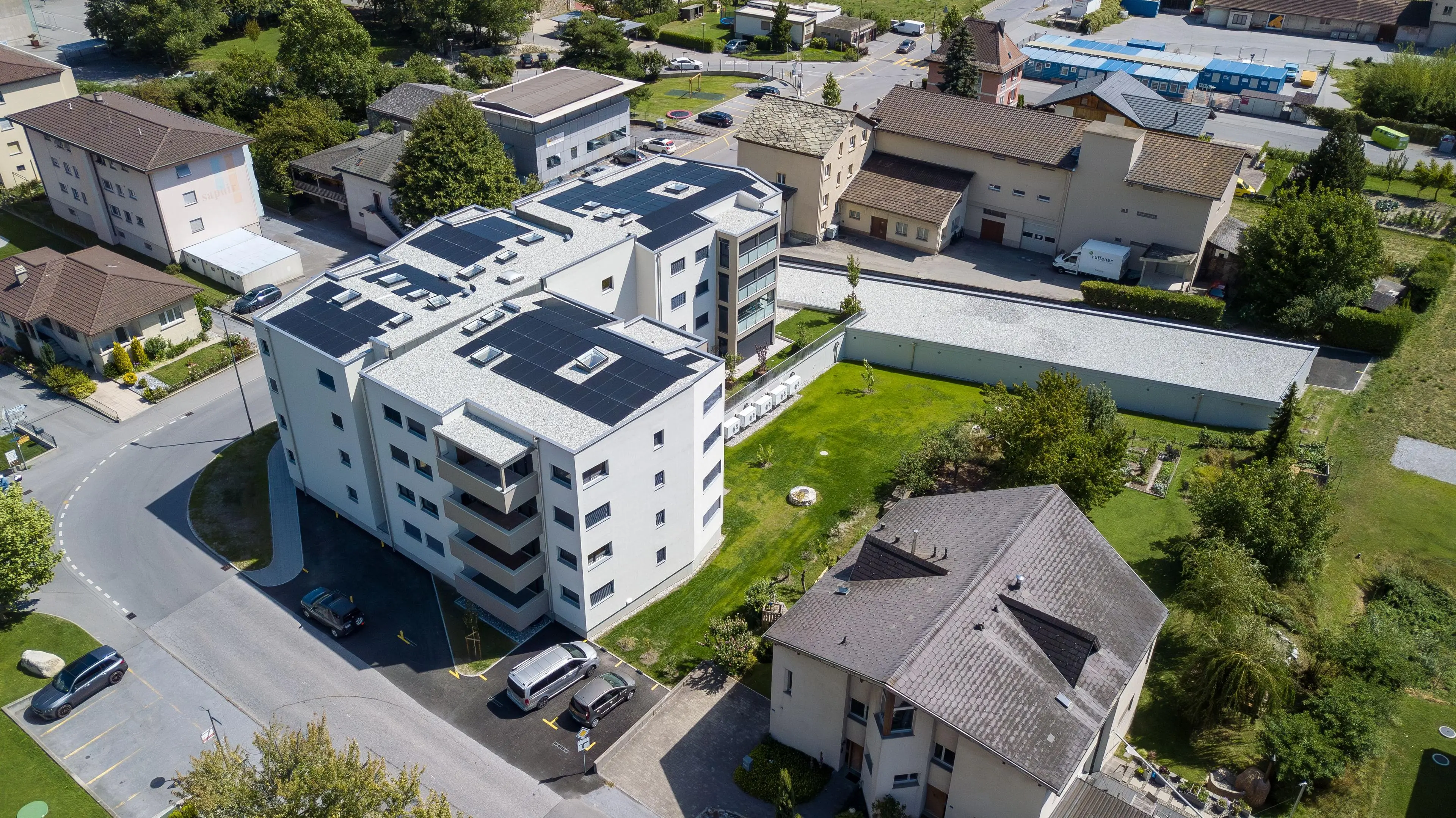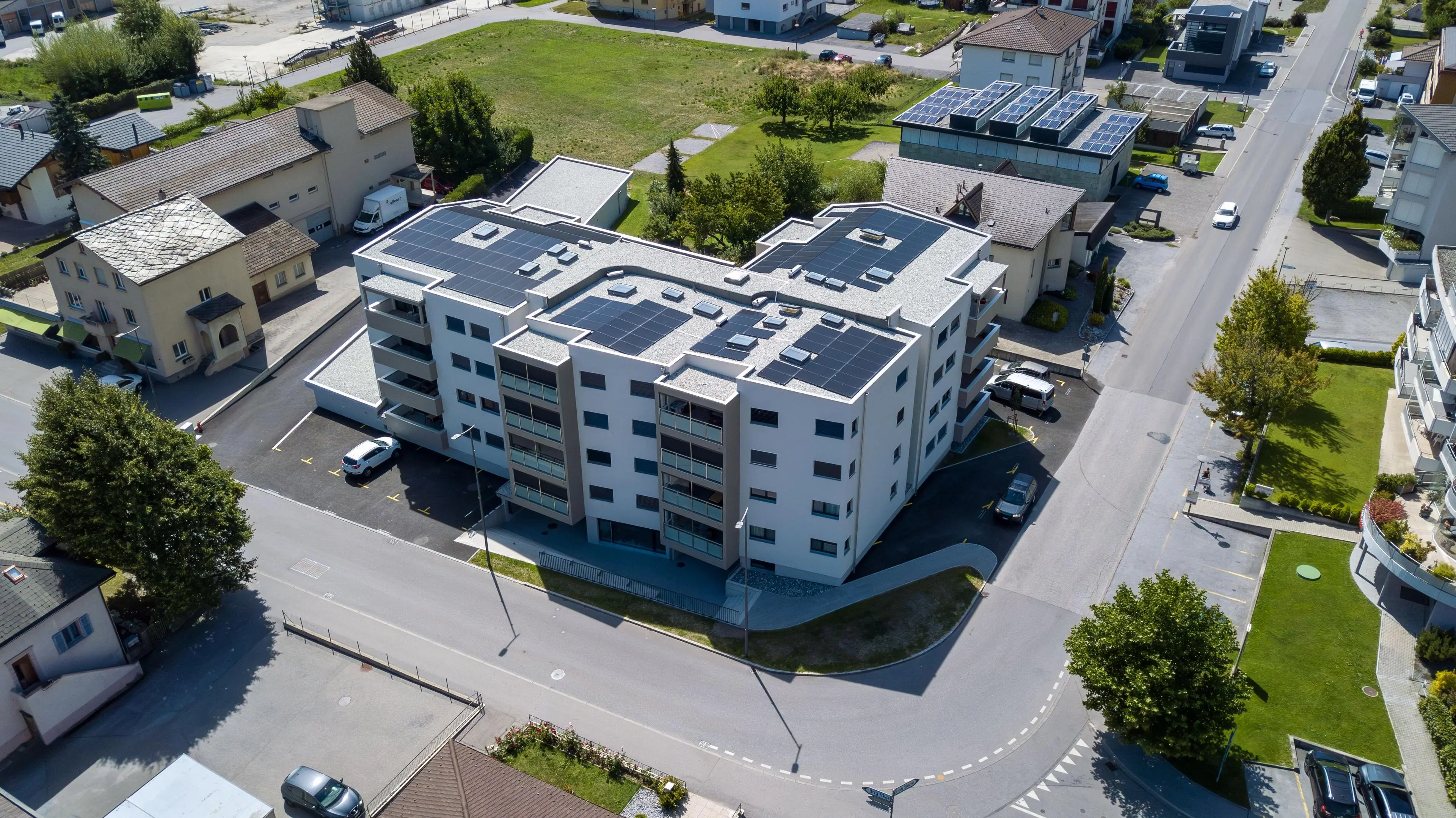 Die Überbauung Maxan in der Gemeinde Raron präsentiert sich als modernes Wohn- und Geschäftsgebäude mit insgesamt 17 Wohneinheiten sowie einer Gewerbefläche. Der südliche Teil des Gebäudes beherbergt eine großzügige Einstellhalle für Fahrzeuge, die den Bewohnern bequemen Zugang und sichere Parkmöglichkeiten bietet. Die Architektur zeichnet sich durch zeitgemäße Gestaltungselemente aus, die harmonisch mit der umgebenden Umwelt verschmelzen. Durch die Kombination von Wohn- und Gewerbenutzung wird eine lebendige und vielseitige Atmosphäre geschaffen, die die Bedürfnisse der Gemeinschaft optimal bedient.